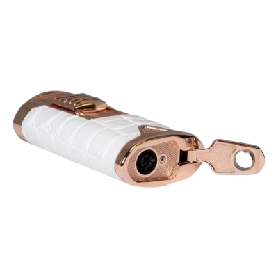 Обвита в луксозна крокодилска кожа в бяло.